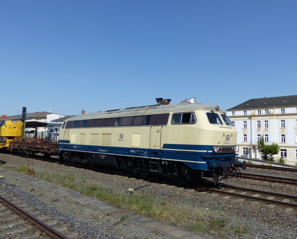Railsystem RP 218 447-1 ( 9280 1218 447-1 D-RPRS ) wartet in Gera mit einem Bauzug auf grünes Licht am 30.4.2024