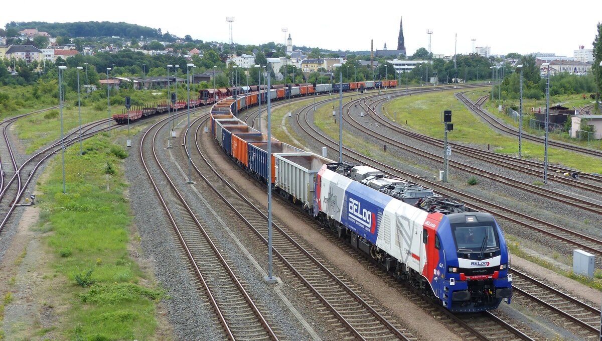 BELog Baustoffe-Entsorgung-Logistik GmbH , Stadler Eurodual 9080 2159 238-5 D-RCM mit einem Leerzug offener Güterwagen in Gera am 8.8.2023