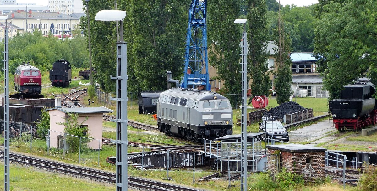 Eine Diesellok mit Öltender ist mal etwas ganz besonderes. Die Budamar West 216 224-6 ( 9280 1216 224-6 D-BDMW ) bei der Arbeit unterwegs in Gera am 27.7.2023.