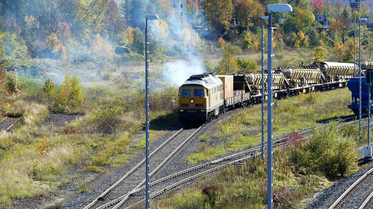 Die gelbe Ludmilla, LOK 13, der Bahnbau Gruppe 233 493-6 ( 9280 1233 493-6 D-DB ) zieht am 23.10.2022 einen Bauzug aus dem Holzbahnhof Gera ins Netz. Mario Ulbricht
