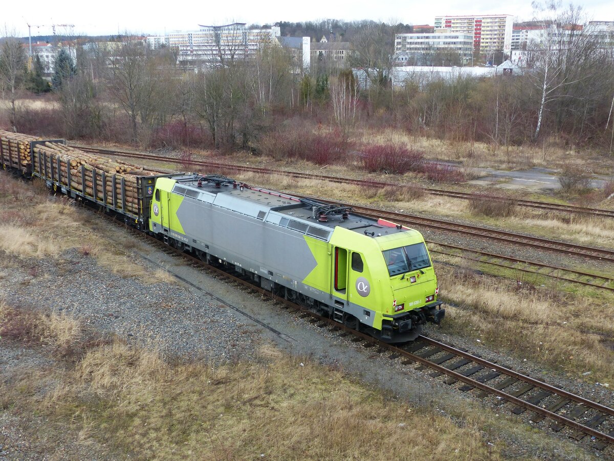 Holzlogistik & Güterbahn HLG,Stadler Eurodual 159 216-1 ( 9080 2159 216-1 D-RCM ) zieht einen Langholzzug ins Netz von Gera am 8.2.2022 Mario Ulbricht