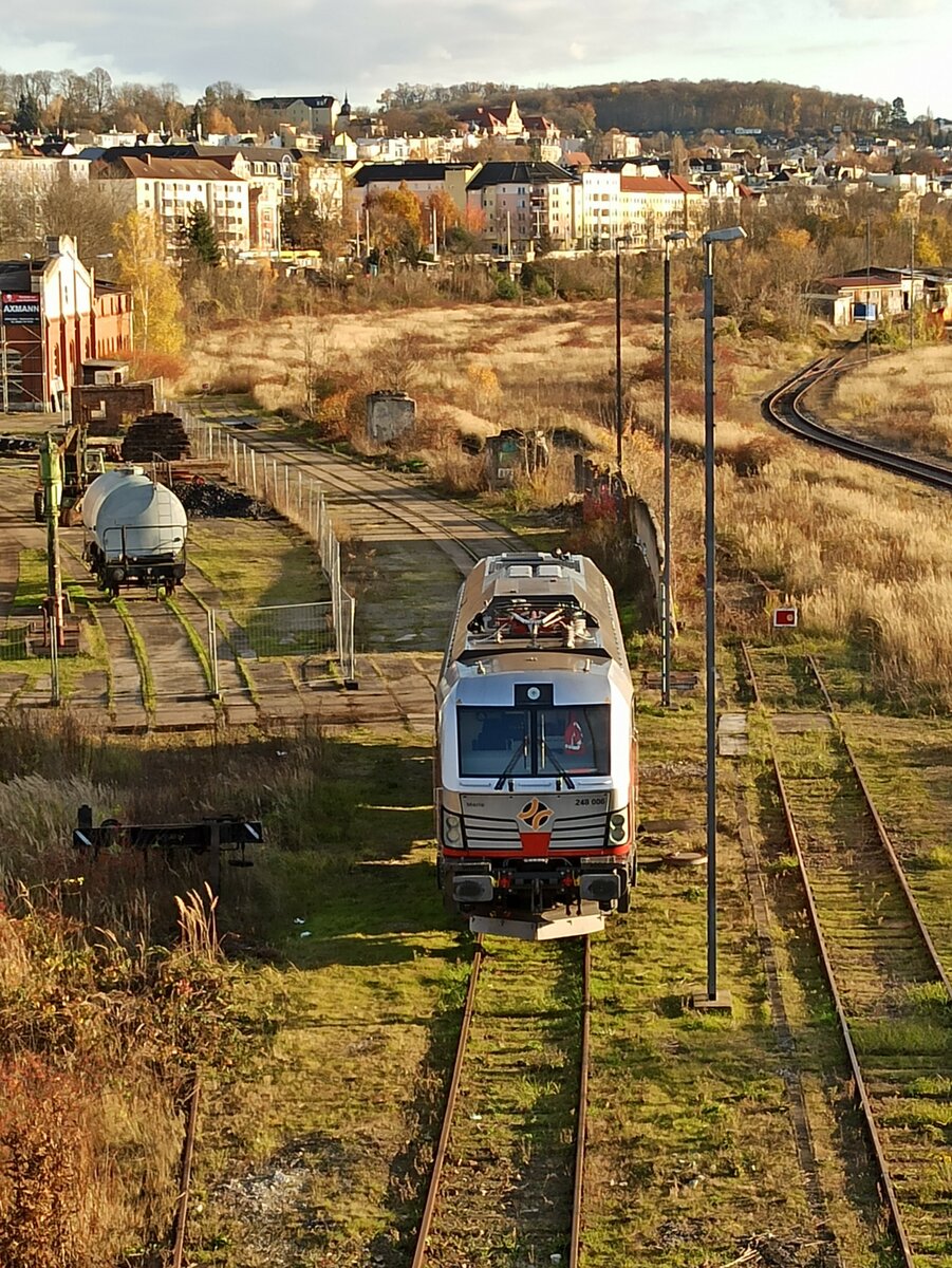 Salzland Rail Service, Ludmilla 232 088-5 ( 9280 1232 088-5 D-SLRS ) zieht am 26.9.2021 10 leere Schotterwagen ins Netz von Gera. Im Hintergrund die neu eröffnete Eisenbahnwelt. Mario Ulbricht