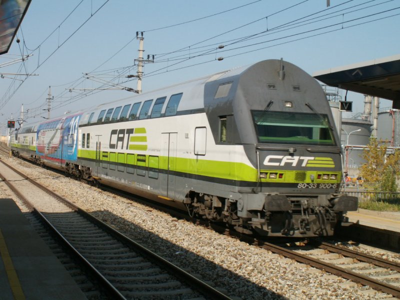 CAT - City Airport Train, Richtung Flughafen Wien bei der Durchfahrt im Bahnhof Mannswörth, 25.9.2006