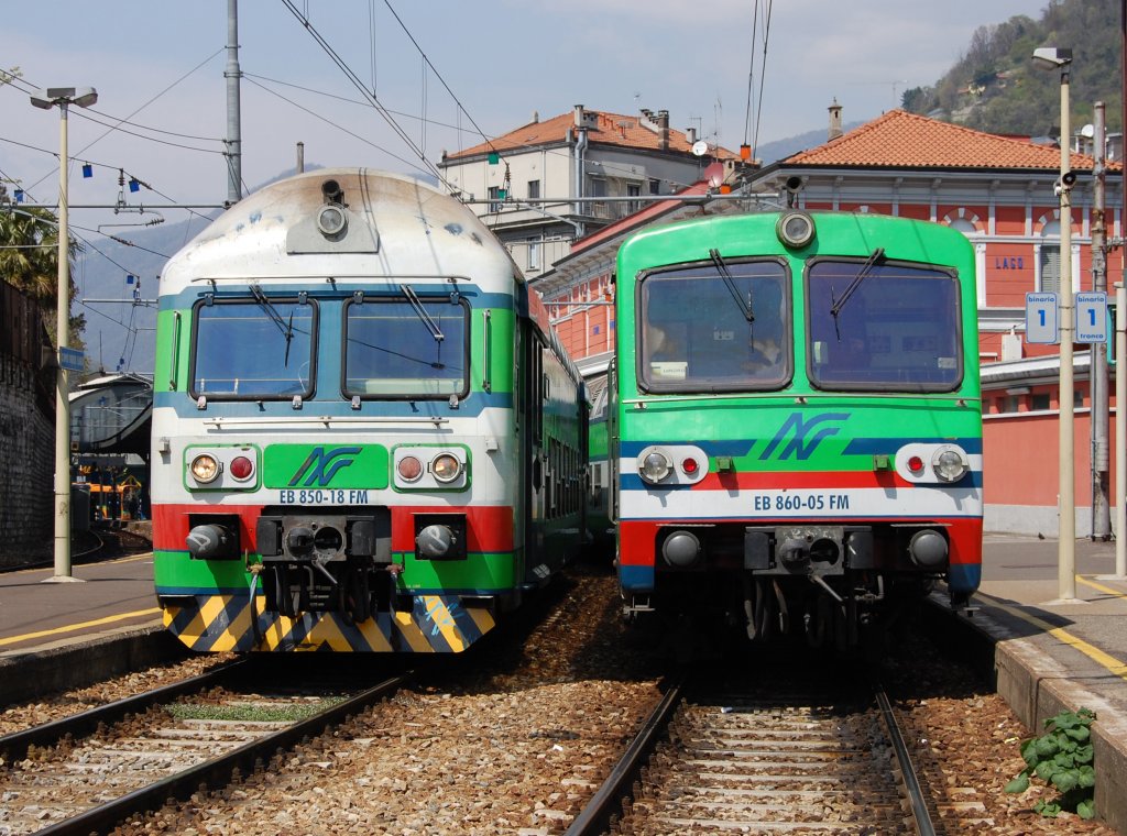 Doppelstock-Triebzüge der LeNORD (seit Mai 2011: Trenord) in Bf. Como Lago Nord; linke EB850-18-FM vor Abfahrt nach Milano Cadorna (ehm. Milano Nord); Blick über Gleise in Richtung Nord, 19.04.2010