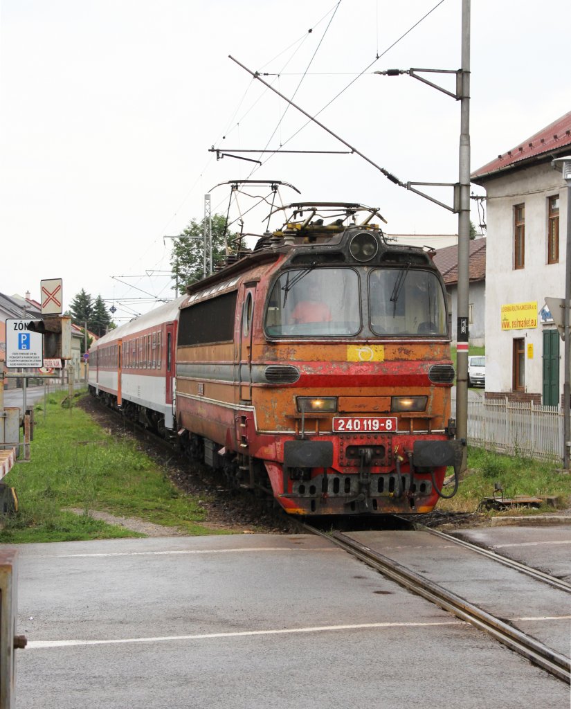 240 119-8 mit Regionalzug Os 7303 (Vrútky/Ruttek, werktags, mit D-Lok –) Banská Bystrica/Neusohl – Zvolen os. st./Altsohl Persbf. vor Bahnübergang im Bereich des Haltepunktes Zvolen mesto/Altsohl Stadt; 09.06.2012 (Samstag)