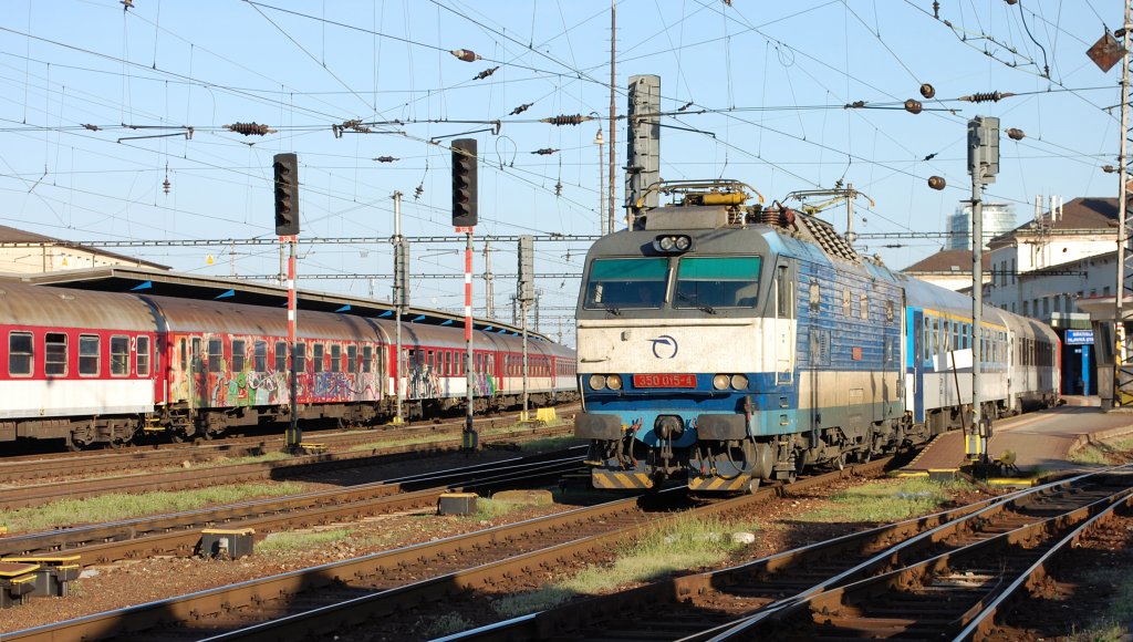 350 015-4 mit EC 270 „Avala“ Belgrad – Budapest – Prag fährt aus Bratislava hl. st./Preßburg Hbf. (SK) gerade ab; 28.04.2012