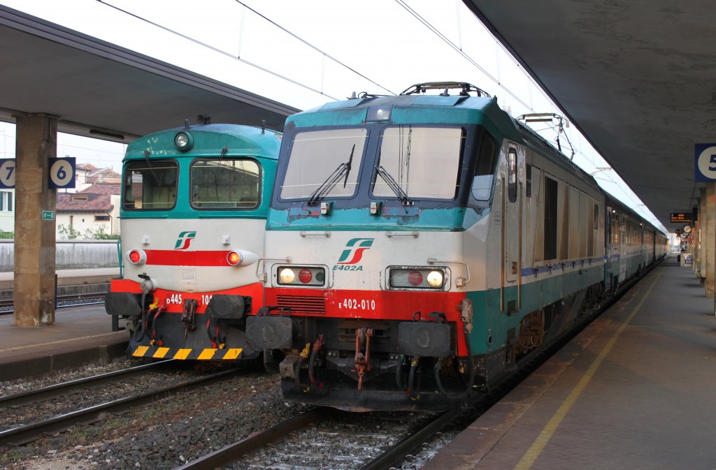D445.1044 und E402-010 mit Regionalzug nach Udine im Bahnhof Treviso C.le, 05.05.2012 morgens
