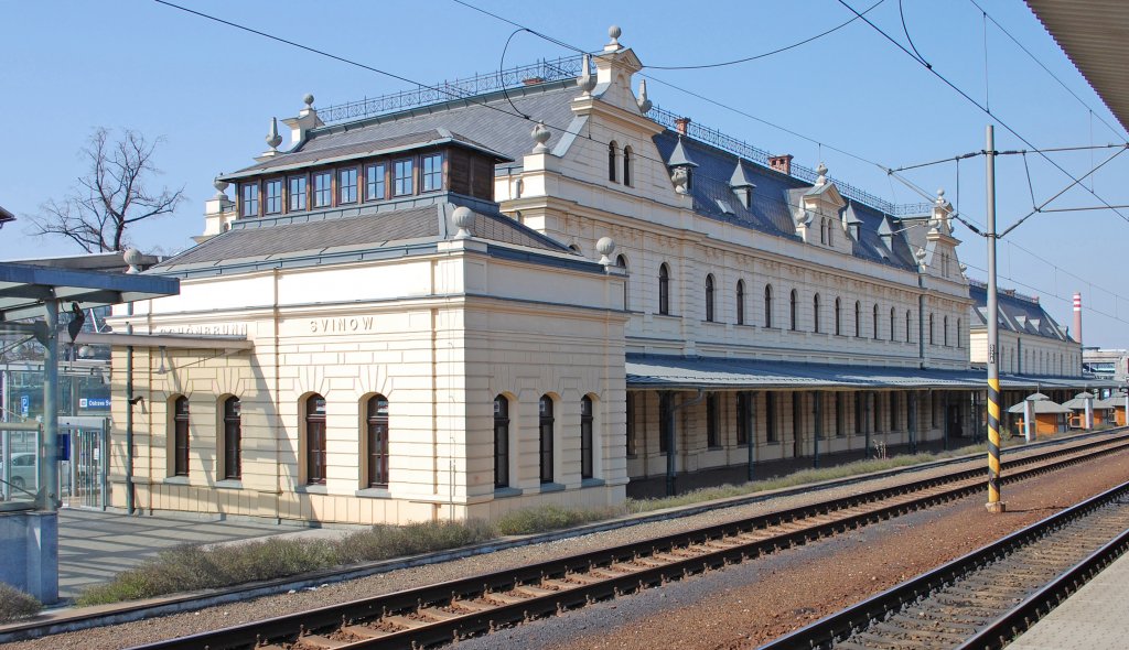 Empfangsgebäude des Bahnhofes Ostrava-Svinov (ehem. Schönbrunn – Svinow; Svinov-Vítkovice/Schönbrunn-Witkowitz; Ostrava-Poruba) an der Kaiser-Ferdinands-Nordbahn, Rekonstruktion zwischen 2004 und 2006; 18.04.2012