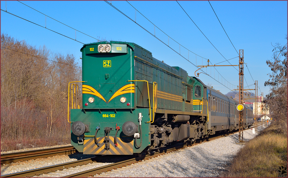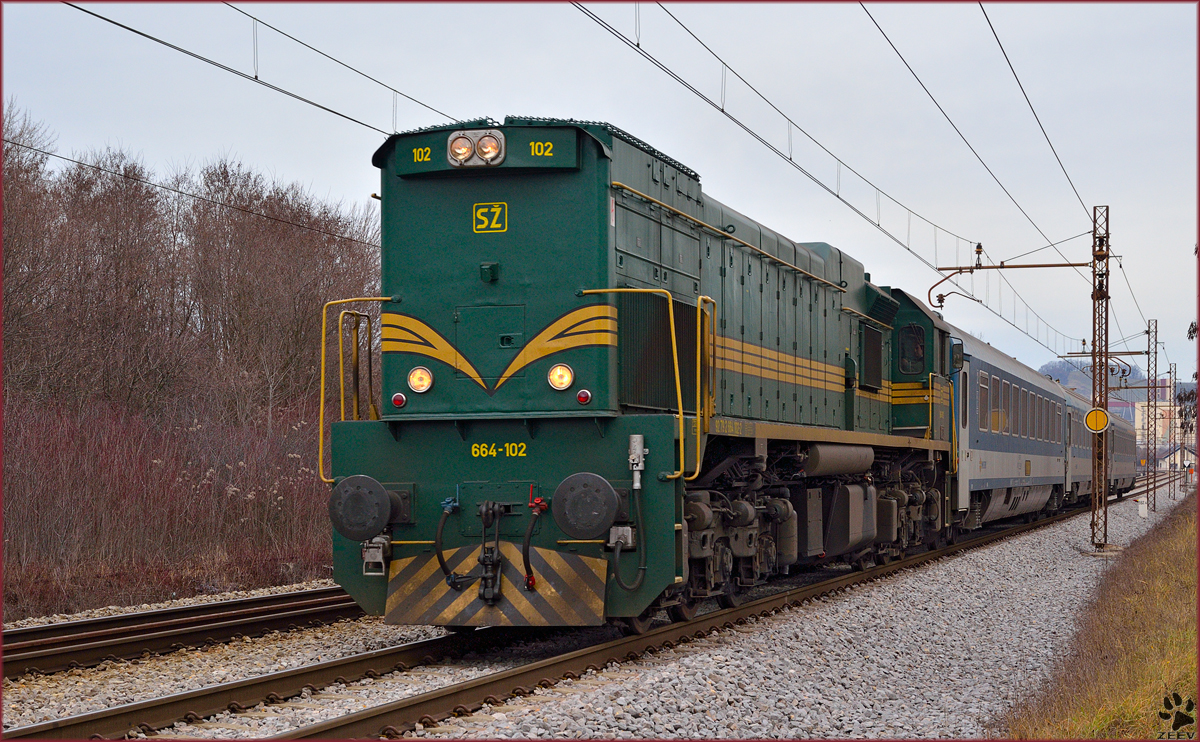 SŽ 664-102 zieht MV247 'Citadella' durch Maribor-Tabor Richtung Budapest. /13.1.2014