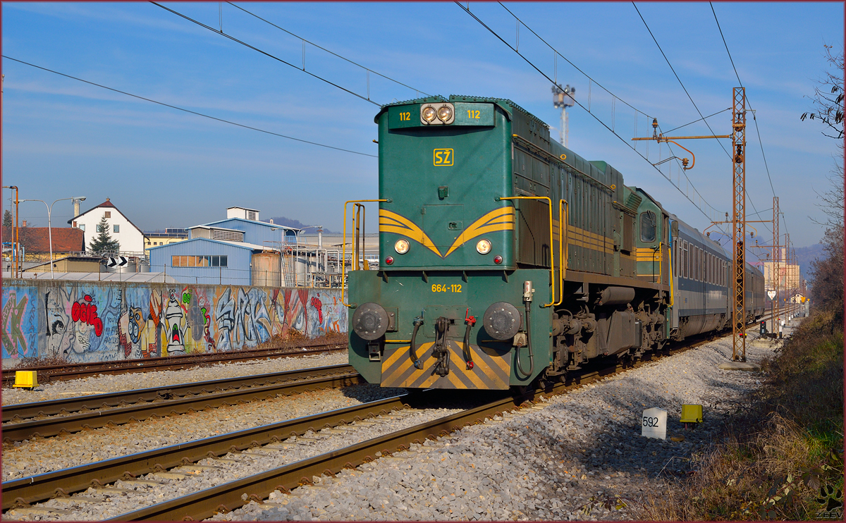 SŽ 664-112 zieht MV247 'Citadella' durch Maribor-Tabor Richtung Budapest. /23.12.2013