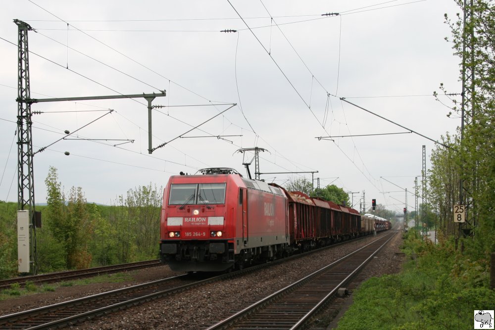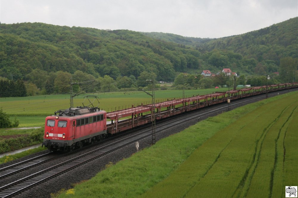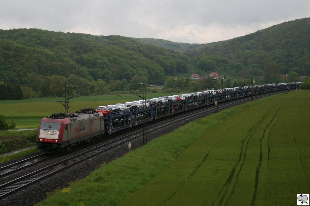 185 181-5, mit einen Ganzzug der Spedition "LKW Walter", mußte am 13. Juni 2010 einen ICE-T den Vorrang lassen und daher im Bahnhof Kronach eine kleine Pause einlegen. Kurz nachdem das Signal auf Grün geschaltet wurde, setzte sich der Zug wieder in Bewegung. Ulrich Slovig