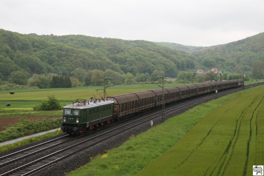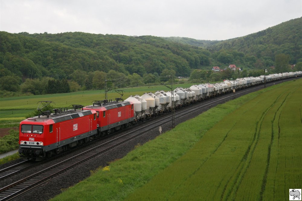Am Abend des 30. Juni 2010 befördern je eine 155, eine 185 und eine 151 (am Zugschluß schiebend, nicht im Bild) einen Selbstentladewagen-Ganzzug über das Trogenbachviadukt in Ludwigstadt bergaufwärts in Richtung Süden. Ulrich Slovig