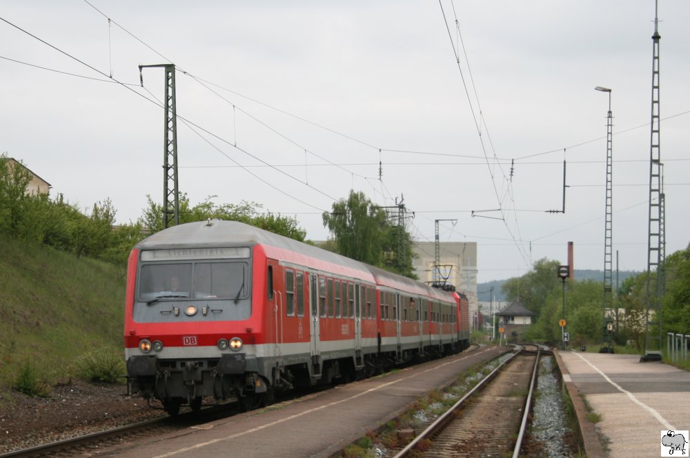 Am 7. Juni 2010 viel mal wieder ein Steuerwagen aus. Dies hatte zur Folge das die Regionalbahnen zwischen Sonneberg und Lichtenfels in "Sandwich" Anordnung fuhren: am Ende je eine 143 und dazwischen zwei Nahverkehrswagen. Auf dem Bild verlässt die Regionalbahn gerade den Bahnhof Coburg in Richtung Sonneberg / Thüringen. Ulrich Slovig