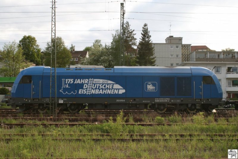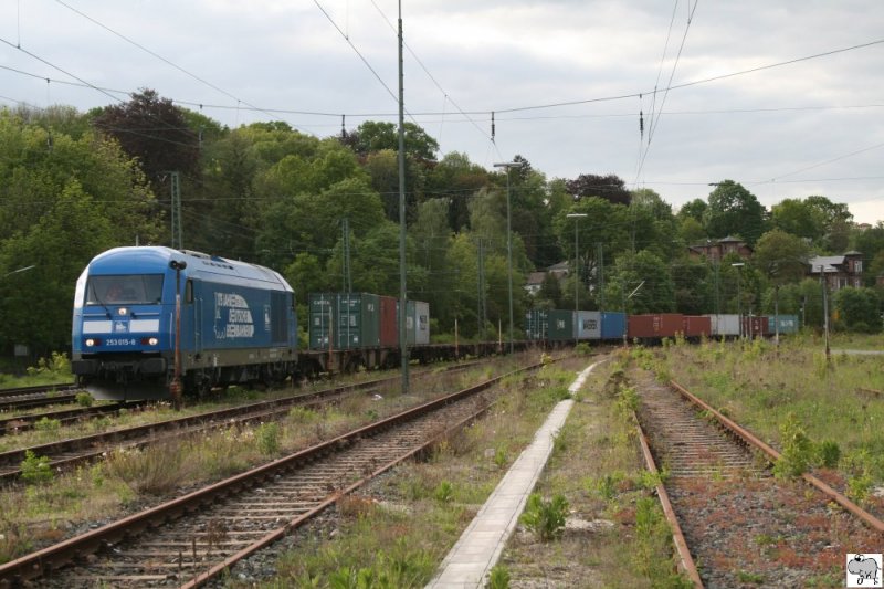 253 015-8 der Pressnitztalbahn wartet mit einen Containerzug am 04. Mai 2009 um halb sieben Uhr Abends im Coburger Güterbahnhof auf die Steckenfreigabe in Richtung Lichtenfels. Auf einer Lokseite trägt sie das Logo  175 Jahre Deutsche Eisenbahnen .