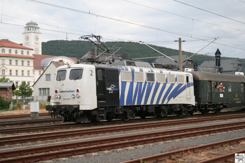 Am 20. Juni 2009 fand wieder mal ein Tag der offenen Tür bei der Modellbahnfirma Piko in Sonneberg statt. Aus diesen Anlass kam 139 310-7 von Lokomotion nach Sonneberg. Sie war am Zugschluß des Sonderzuges aus Stuttgart, welcher von 03 2295-8 gezogen wurde, angehängt.
