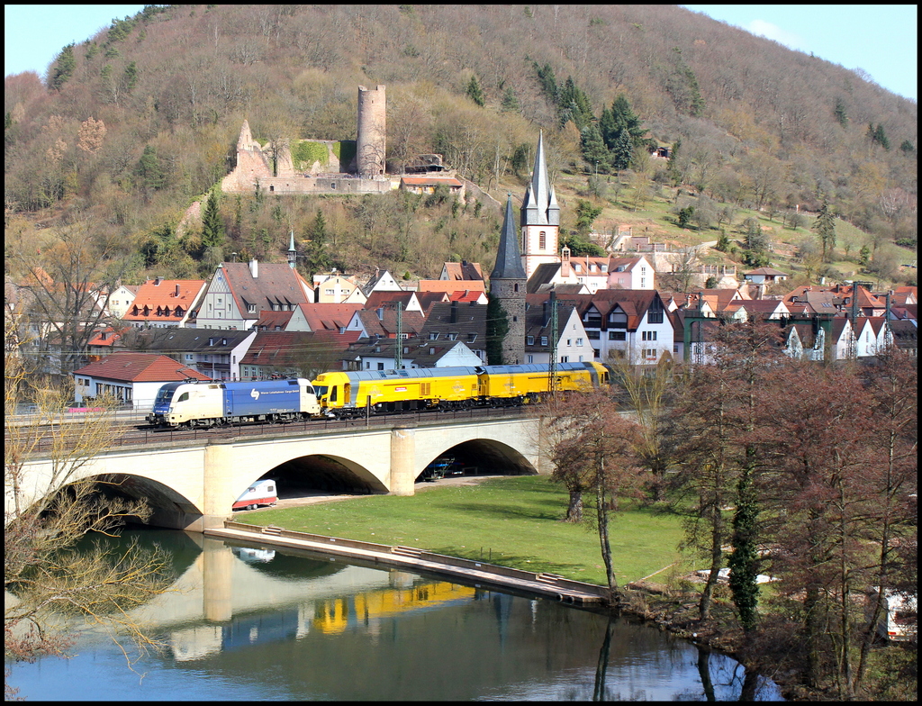 182 524 der WLC mit einer Baumaschiene für die Bahnbaugruppe am 07.04.13 in Gemünden am Main