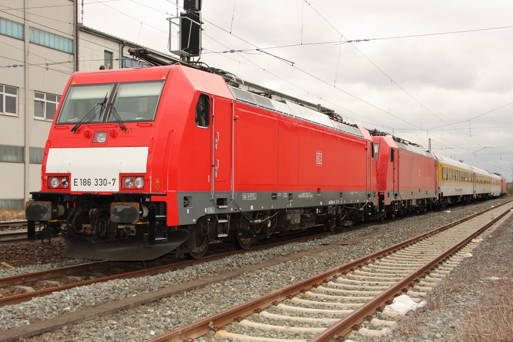 186 330-7 und 186 335-6 stehen am Abend des 30.03.2012 mit drei Messwagen sowie der 145 080-8 im Bahnhof Lichtenfels, nachdem Sie im Frankenwald unterwegs waren.