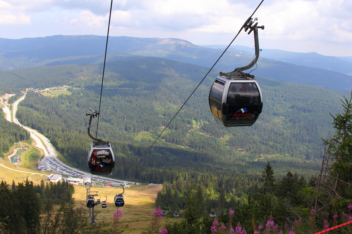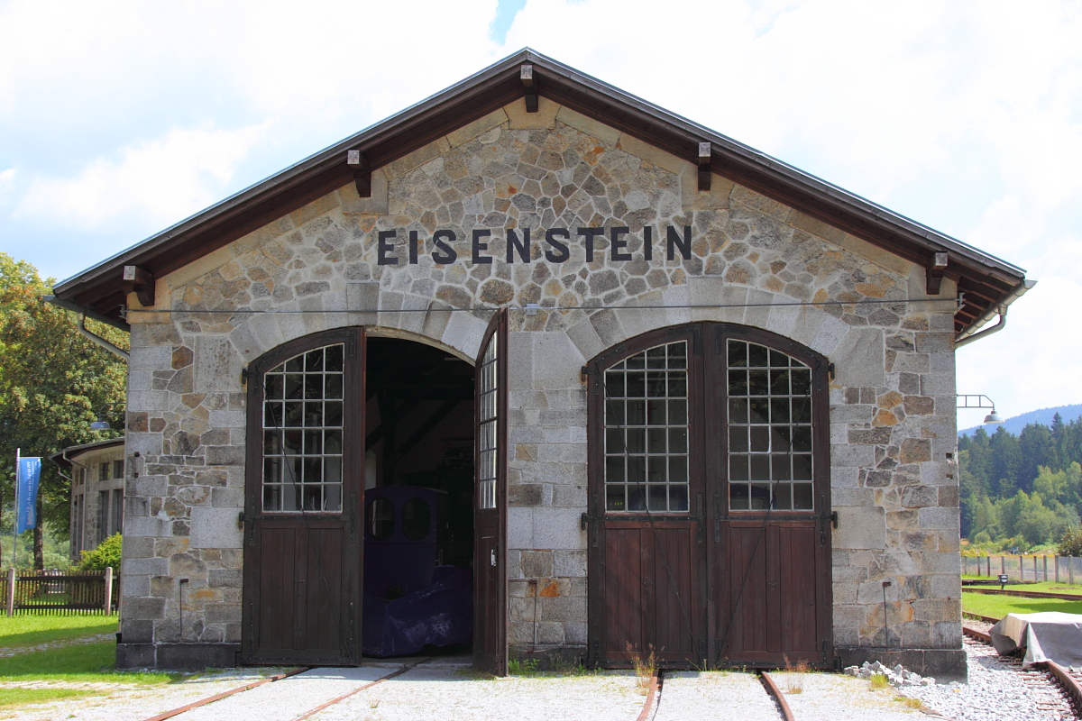 Blick auf das Empfangsgebäude des Bahnhofs Bayerisch Eisenstein am 18.08.2016. Die Staatsgrenze geht mitten durch das Empfangsgebäude, auf der linken Seite befindet sich Deutschland und rechts ist Tschechien. Markus K.