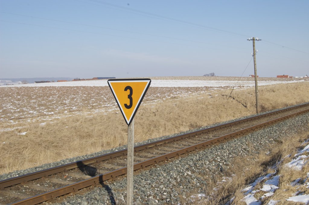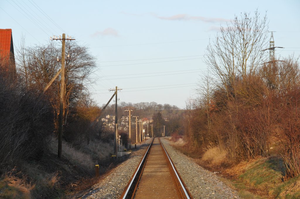 Blick auf die Schienen und Telegrafenmasten in Birkenfeld der Strecke Neustadt Aisch bis Steinach. Nach den ersten Zwei Masten stehen die Neuen Masten, die nach meinem Geschmack viel hässlicher geworden sind, da sich die Zwei unteren Isolatoren weiter oben und auf gleicher Höhe befinden. Wer noch dafür ist schreibt mir einfach. Blick nach Neustadt, Nord-Osten. Dieses Foto wurde am Bahnübergang aufgenommen.