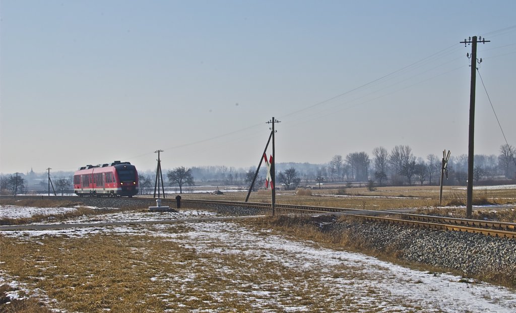 Ein Regionalzug der Baureihe 648, der gerade vom Ipsheimer Bahnhof kommt und gleich Dottenheim erreicht.