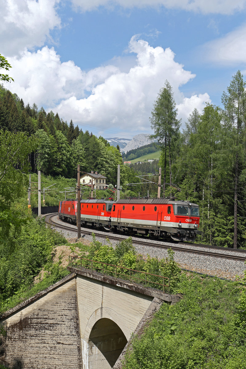Vor mächtigen Gewitterköpfen über der Rax,fahren 1144.093+271+1116 mit GAG-43401 vor dem Ghega-Museum hinter der Kalten-Rinne am 10.5.18 bei Breitenstein bergwärts. andreas hansch
