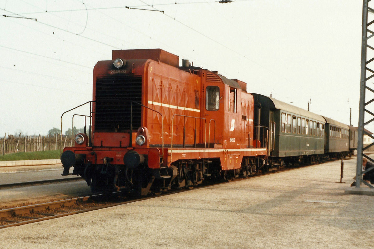 2045.02 wartet in Hadersdorf am Kamp mit R-6219 auf die Abfahrt. 1.5.86
