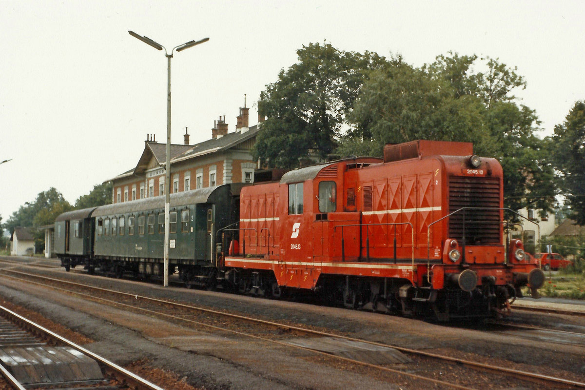 2045.13 steht im August 86 mit einem Reg. abfahrtsbereit im Bhf.Dobermannsdorf.