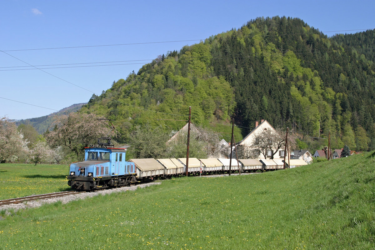 E-3 der Lokalbahn Mixnitz-St.Erhard kommt mit einen Magnesit-G.Z. aus Breitenau und wird in Kürze den Endpunkt in Mixnitz erreichen. Mautstatt am 16.4.16