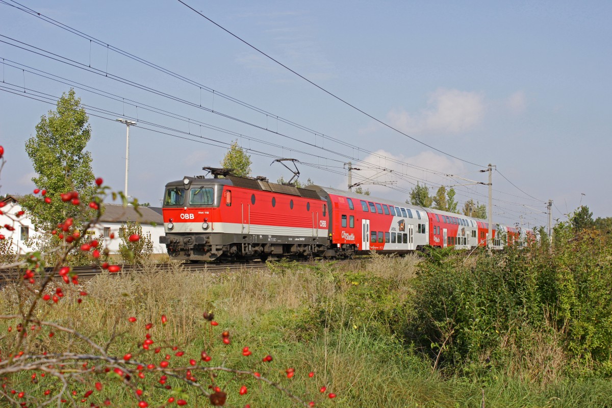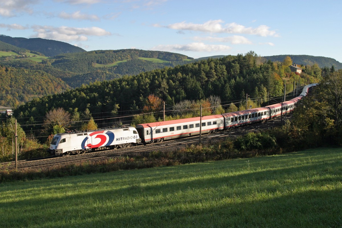 1116.264 Ö-3 fährt beim RJ-531 im Herbstlichen Gegenlicht am Eichberg Nachschiebe. 18.10.14