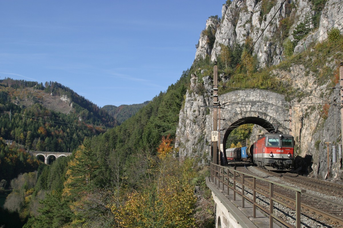 Umgeben von Schneeberg und herrlicher Herbststimmung befinden sich 1144.224+066 mit G-55501 zwischen Payerbach und Küb am 1.11.14