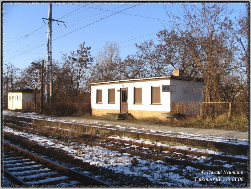 In Kürze wird das - zugegeben nicht gerade schöne - Stellwerk W1 in Falkenberg/E. seinen Dienst quittieren u. abgerissen werden, infolge des Neubaus des Kreuzungsbauwerks. Seine Aufgaben übernimmt dann das Stellwerk W2 das dafür einen neuen Stelltisch erhält. Die neuen Lichtsignale sind nun auch schon gesetzt. Das Bild entstand im Jan.06.