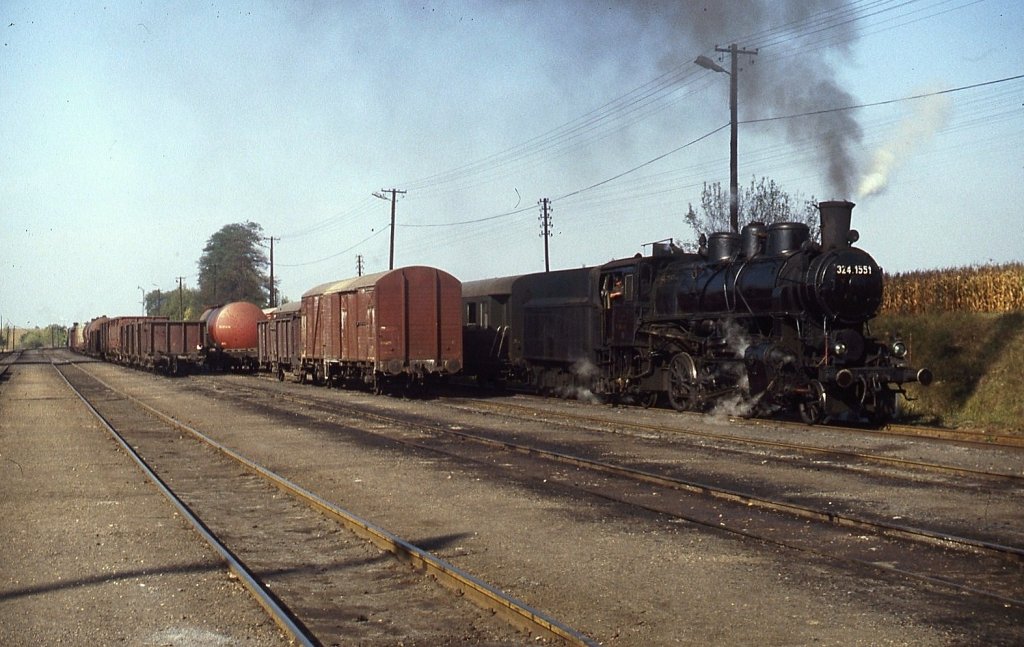 324 1551 rangiert im Oktober 1978 im Bahnhof Veszpremvarsany, dem Kreuzungsbahnhof der Strecken Györ - Veszprem und Papa - Tatabanya. Die letztere - heute stillgelegte - Strecke war damals noch fest in der Hand der Baureihe 324.