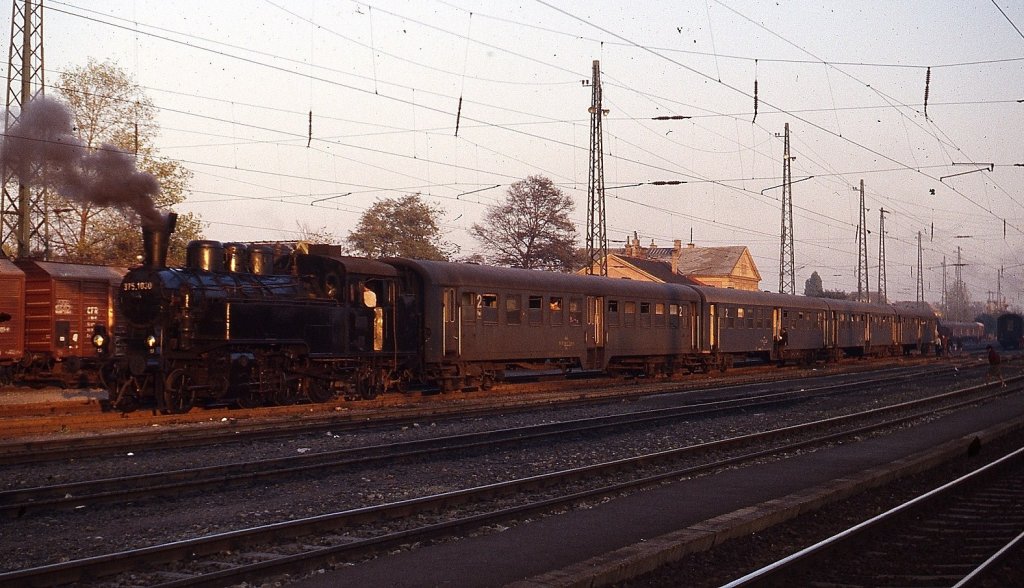 375 1030 vor dem abendlichen Personenzug nach Balassagyarmat im Bahnhof Vac (Oktober 1978)