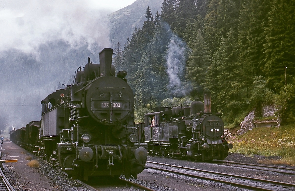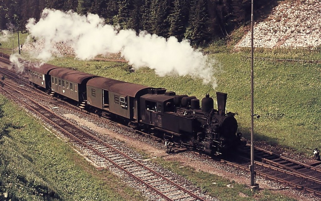 97 208 verläßt im Juni 1974 mit einem Personenzug den Bahnhof Präbichl in Richtung Eisenerz