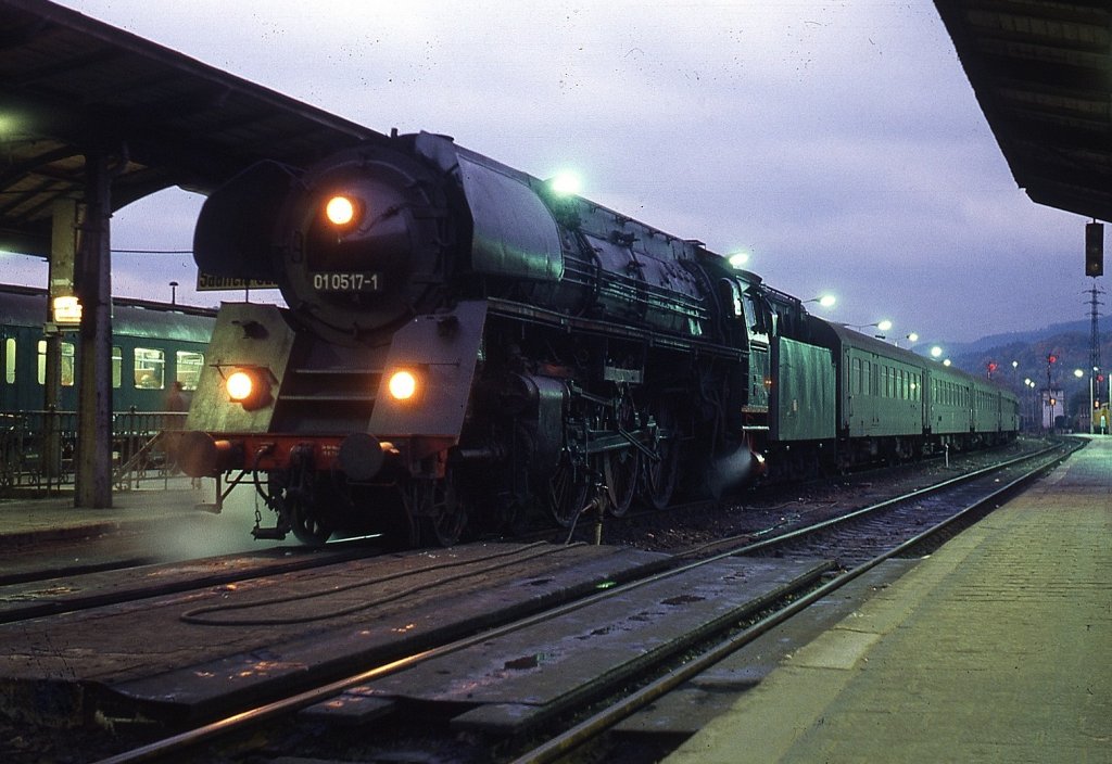 An einem Oktoberabend im Jahr 1980 wartet 01 0517-1 mit einem Personenzug im Bahnhof Saalfeld auf die Abfahrt in Richtung Jena