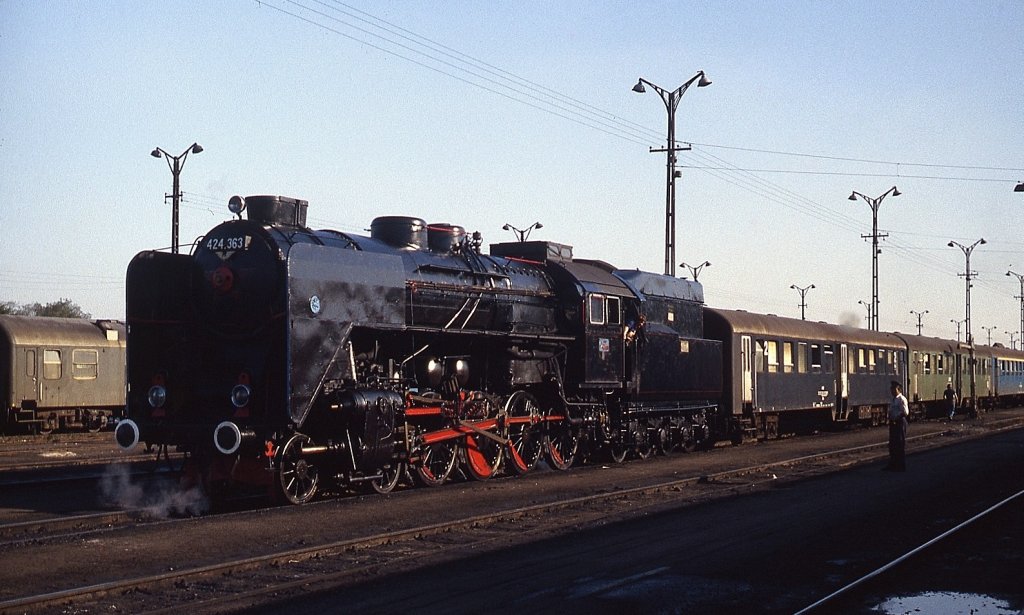 An einem sonnigen Oktobernachmittag im Jahr 1978 steht die ölgefeuerte 424 363 der MAV im Bahnhof Szombathely zur Abfahrt bereit