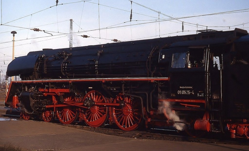 Aus dieser Perspektive kommt die Eleganz der 01.5 besonders zur Geltung (01 0525-4 Leipzig Hbf. Oktober 1978)