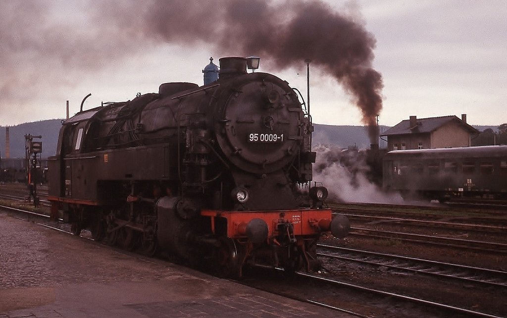 Bahnhof Saalfeld im Oktober 1980: Während im Hintergrund eine Lokomotive der Baureihe 44 rangiert, pausiert 95 0009-1 am Bahnsteig.