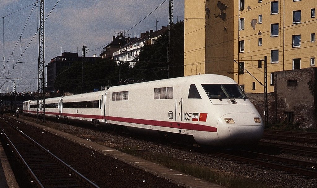 Der ICE-Vorläuferzug InterCityExperimental hatte am 15.06.1989 die Ehre, den sowjetischen Staatspräsidenten Michael Gorbatschow und den nordrhein-westfälischen Ministerpräsidenten Johannes Rau samt Gattinnen von Dortmund nach Düsseldorf zu befördern, erkennbar an den unter dem Führerstand angebrachten Länderwappen. Hier ist er bei der Durchfahrt in Düsseldorf Wehrhahn zu sehen.