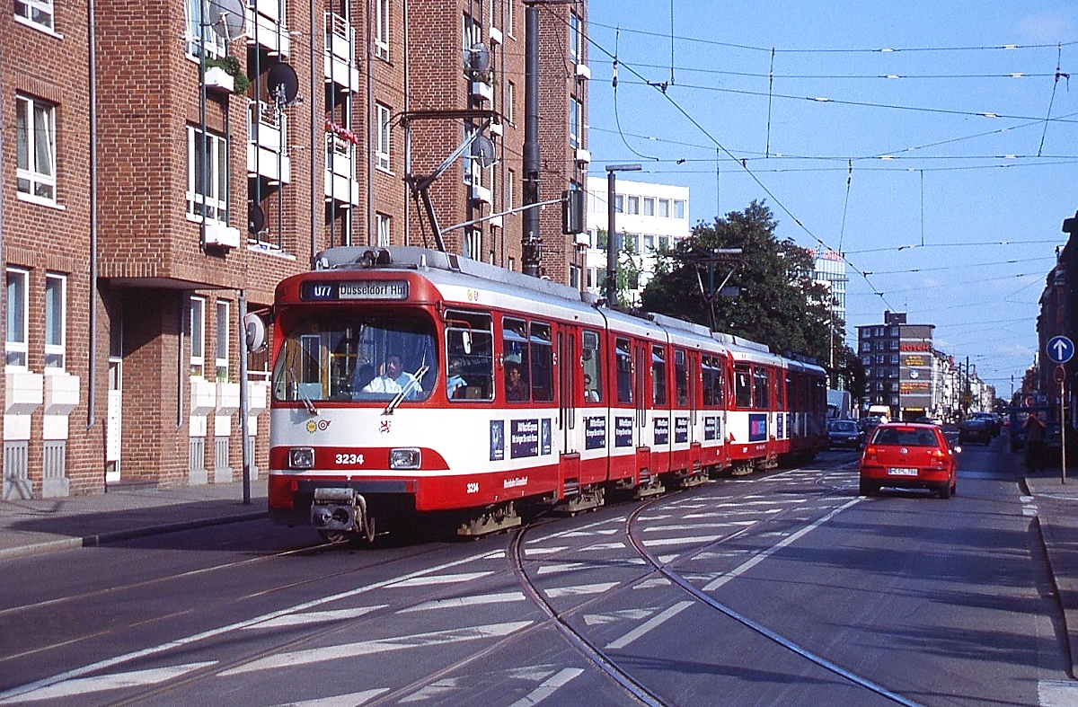 Abschied von den GT8SU der Rheinbahn: Auf dieser Aufnahme aus dem Jahr 1992, die den GT8SU 3234 und einen weiteren GT8SU in der Kölner Straße zeigt, lassen sich die äusserlichen Unterschiede zur Ursprungsausführung gut erkennen: Begradigung der rechten Front/Einstiegsseite und Umbau auf Klapptrittstufen. Diese Strecke verschwand mit der Inbetriebnahme der Tunnelstrecke zwischen Kaiserslauterner Straße und Hauptbahnhof im Jahre 1992. Horst Lüdicke