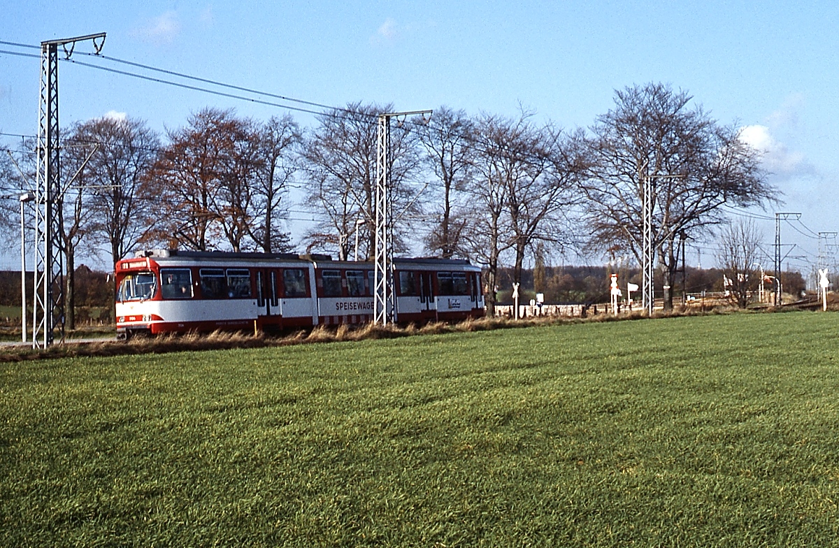 Rückblick auf den Einsatz der GT8SU bei der Rheinbahn Düsseldorf: Im Februar 1981 erreicht der GT8SU 3104 auf seiner Fahrt von Duisburg nach Düsseldorf die idyllisch im Grünen gelegene Haltestelle Froschenteich. Andreaskreuze und Oberleitungsmasten vermitteln noch das Flair der früheren Überlandbahn der Linie D. Die GT8SU 3101-04 setzten eine langjährige Tradition der Rheinbahn auf den Fernbahnlinien fort und verfügten in der Mitte über ein Speiseabteil (die Aufschrift "Speeisewagen" ist wohl etwas zu hoch gegriffen). Die ländliche Idylle gehört heute durch den Bau der mehrspurigen B 8n leider der Vergangenheit an. Horst Lüdicke