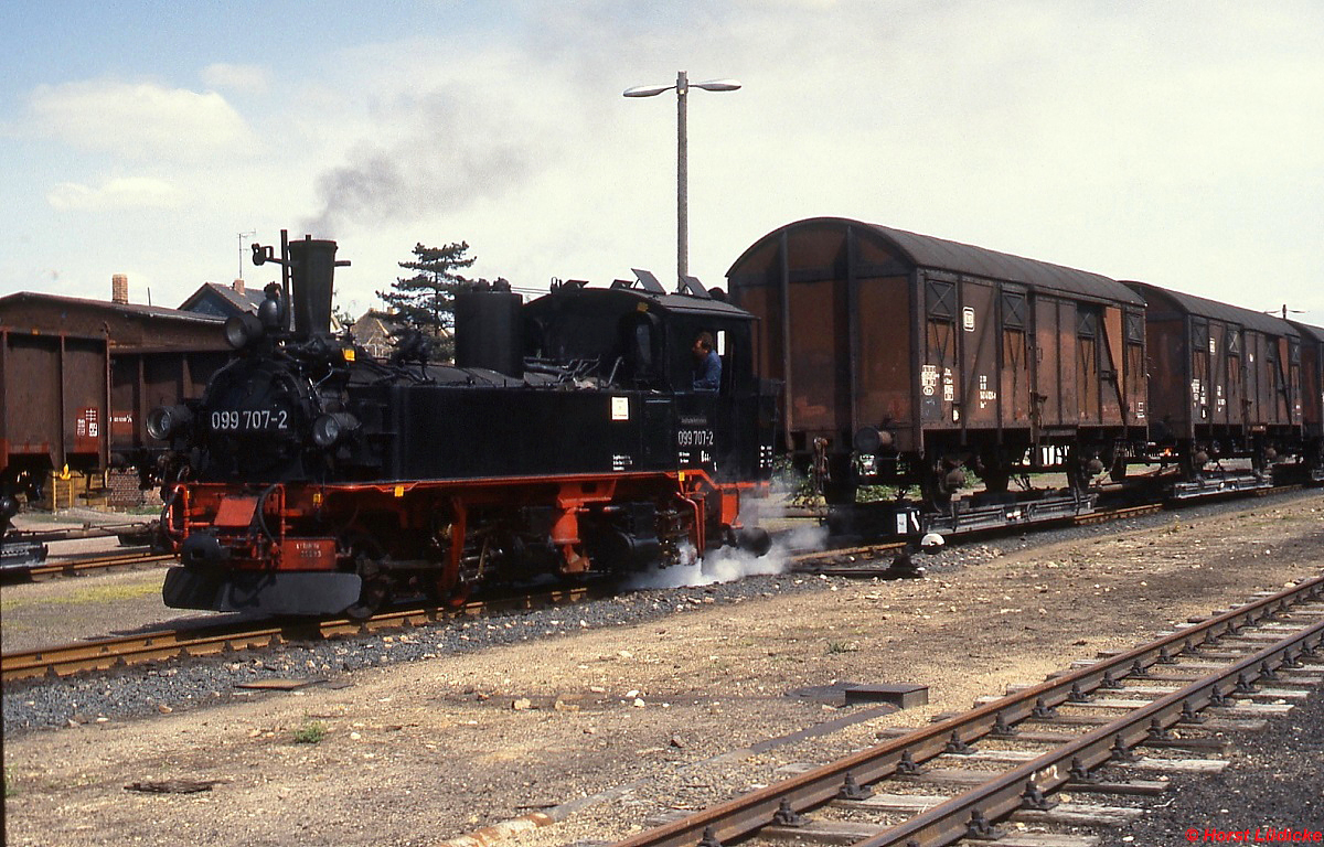 099 707-2 rangiert im Mai 1993 im Bahnhof Mügeln. Bei einer sächsischen IV K erscheint die computergerechte Bezeichnung etwas deplaziert.