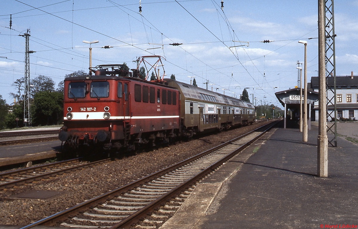 142 107-2 verläßt im Mai 1993 mit einer Doppelstockwagen-Garnitur den Bahnhof Oschatz