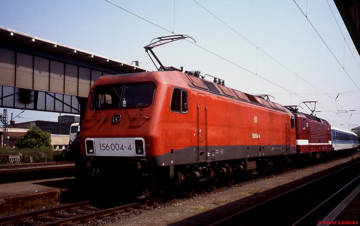 156 004-4 und eine unbekannte 143 sind Mitte der 1990er Jahre mit einem Interregio in Zwickau eingetroffen. Bei der 156 handelte es sich um die letzte DR-Elektrolokentwicklung, die 4 von LEW/AEG gebauten Exempare wurden als Baureihe 252 1991 in Dienst gestellt. Zu einer Serienfertigung kam es nach der Vereinigung von DB und DR nicht mehr - einerseits waren aufgrund des rückläufigen Güteraufkommens genug Elektroloks verfügbar, andererseits setzte die DB AG auf die (damals) neue Drehstromtechnik. 2004 gelangten die Lokomotiven zur Mitteldeutschen Eisenbahn.
