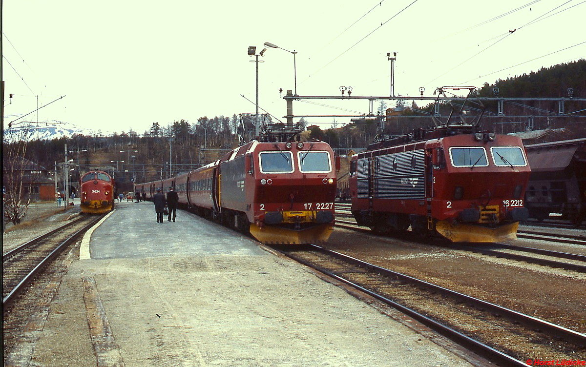 Im Mai 1988 ist El 17 2227 mit einem Schnellzug von Trondheim nach Oslo in Dombas eingetroffen, daneben El 16 2212. Im Hintergrund Di 3.624 vor einem Personenzug nach Andalsnes.