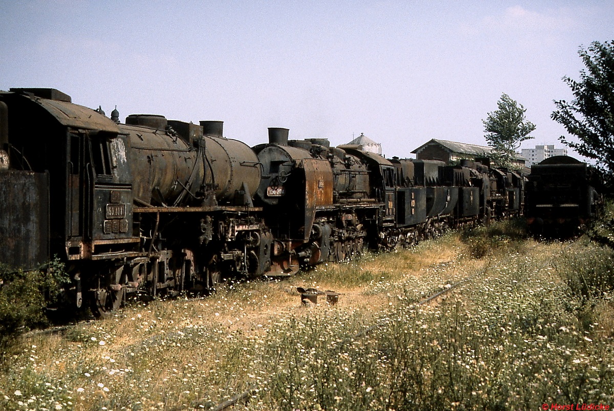 Im Sommer 1992 standen noch zahlreiche Dampflokomotiven der Baureihen 50.1, 230 und 150 in Bacau abgestellt, im Vordergrund 2 Lokomotiven der Baureihe 150 (rumänische Nachbauten der DR-Baureihe 50), 50.204 besaß einen Giesl-Ejektor.