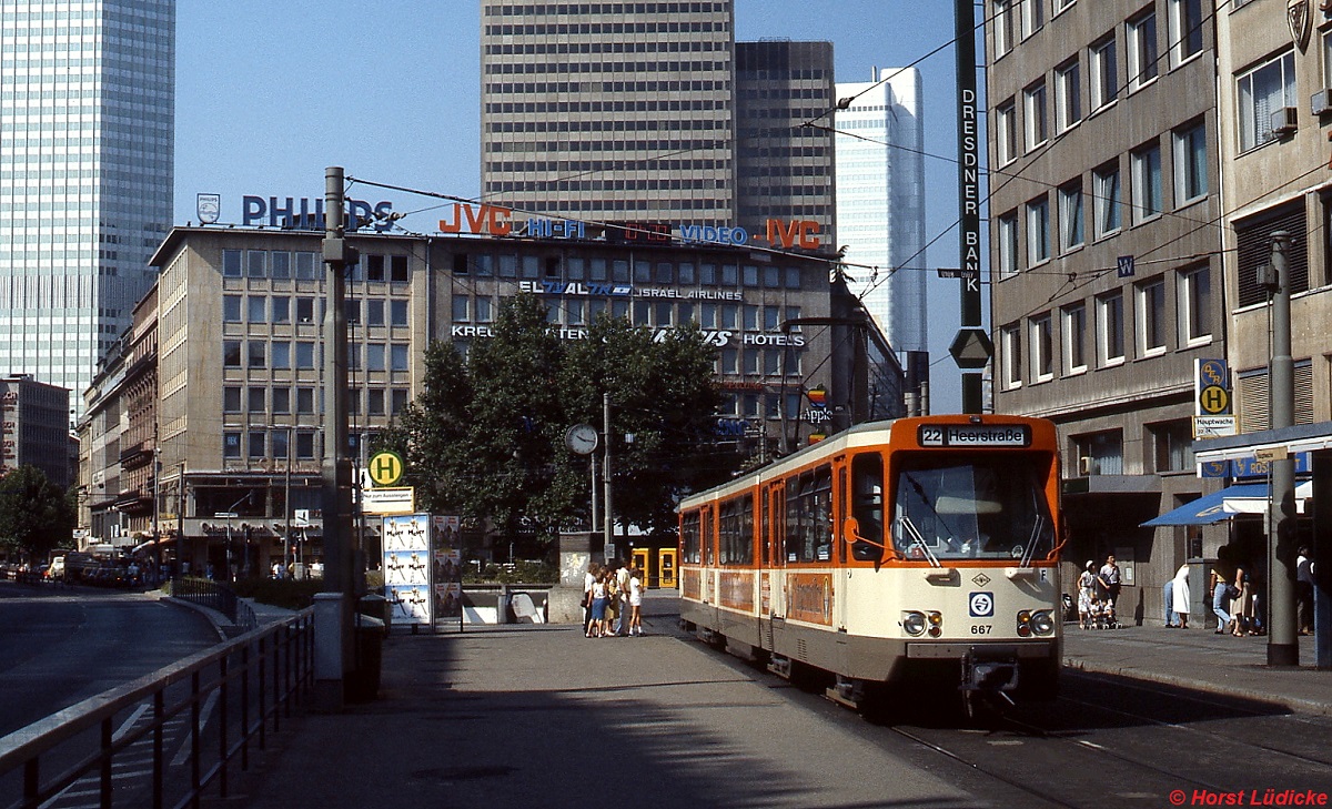 An der Endhaltestelle Hauptwache wartet P-Tw 687 als Linie 22 auf die Abfahrt in Richtung Heerstraße (Sommer 1986)
