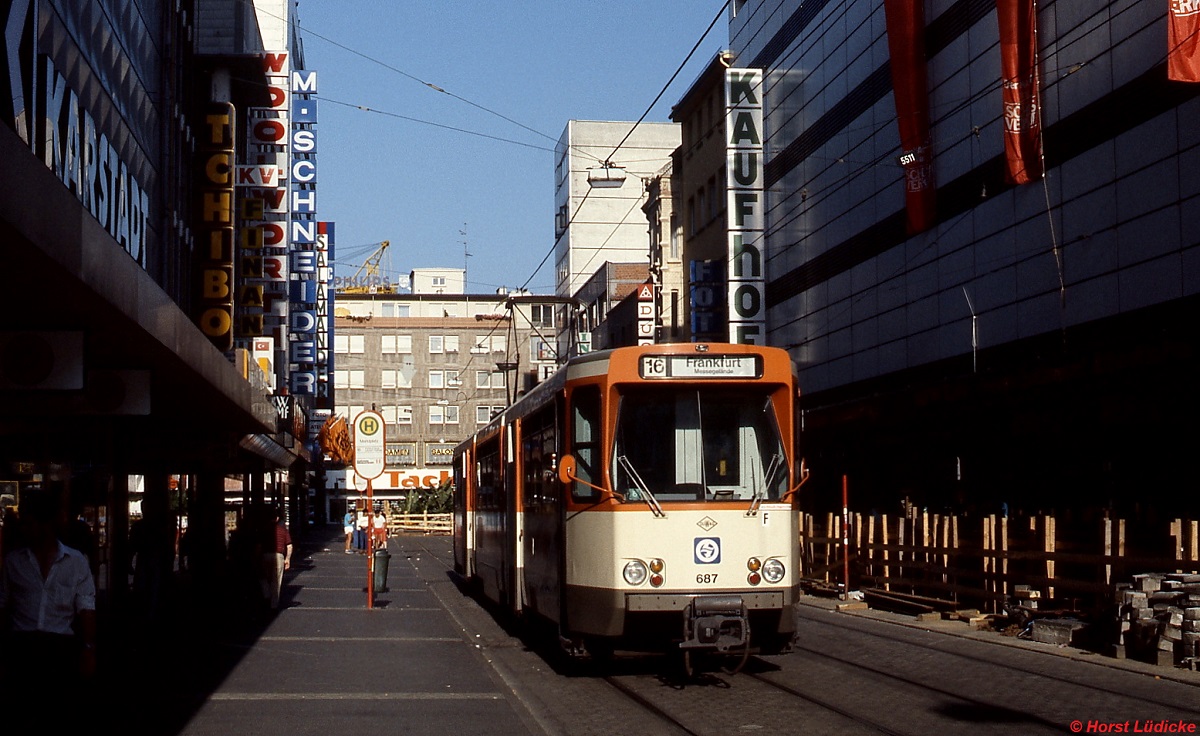 Bis 1996 endete die Linie 16 der Frankfurter Straßenbahn in der Offenbacher Innenstadt am Marktplatz, hier P-Tw 687 im Sommer 1986