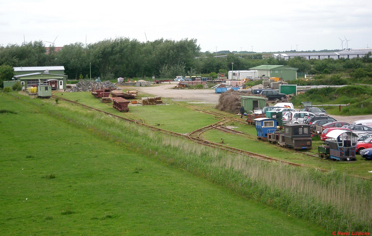 Blick auf einige abgestellte Fahrzeuge der Halligbahn Dagebüll-Oland-Langeneß am 14.10.2010. Mit der Lore im Hintergrund sind gerade abreisende Feriengäste angekommen, übrigens die einzige Möglichkeit für Ortsfremde, um mitzufahren.