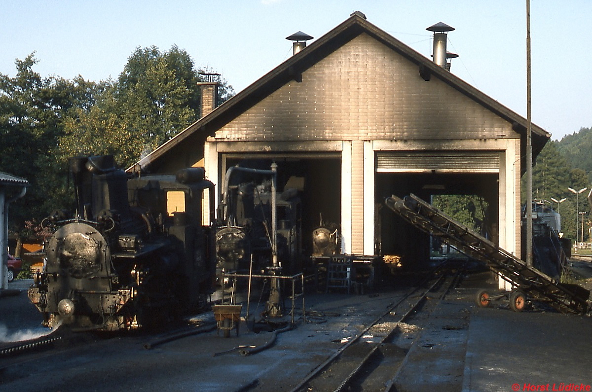 Blick ins Heizhaus Puchberg mit drei Lokomotiven der Reihe 999 (September 1990)